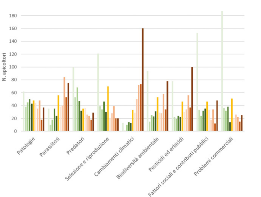 La Commissione Apicoltura dell’ASPA (Associazione per la Scienza e le Produzioni Animali), attiva dal 2020, ha condotto un’ampia indagine per raccogliere direttamente dagli apicoltori le problematiche più sentite nel settore. Attraverso un questionario online, compilato da 478 apicoltori, sono emerse le principali fonti di preoccupazione: in testa la varroa, seguita dai cambiamenti climatici e dall’uso intensivo di pesticidi ed erbicidi.
